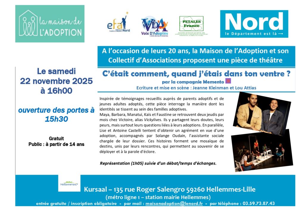 Théâtre et échanges – Pour les postulants, les parents et les enfants de plus de 14 ans À l’occasion des 20 ans de la Maison de l’Adoption et son Collectif d’Associations vous proposent une pièce de théâtre “C’était comment, quand j’étais dans ton ventre” suivie d’un temps d’échanges (animé aussi par EFA59) :
